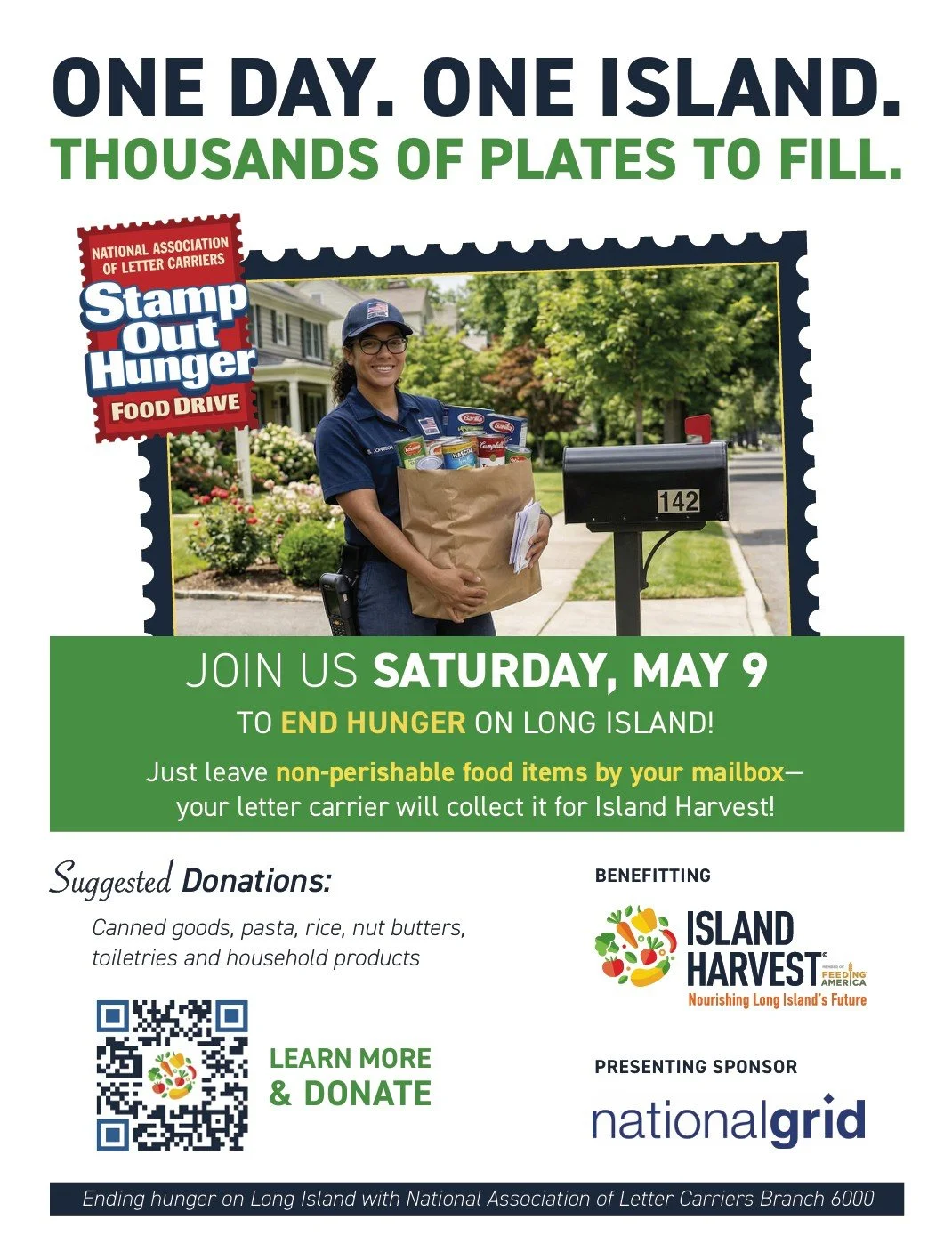 The National Association of Letter Carriers Branch 6000 and the United States Postal Service in partnership with Island Harvest will be collaborating on our 34th annual STAMP OUT HUNGER FOOD DRIVE, on Saturday May 9, 2026.